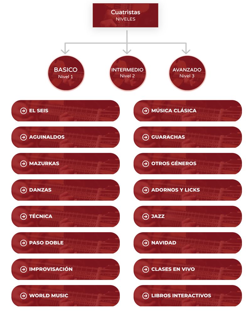 Cuatristas.com cuenta con más de 500 Clases de Cuatro en línea en formato de video. Todos los meses encontrarás más material para que continués aprendiendo todo lo relacionado al Cuatro. Cada clase incluye material que le respalda tal como, tablaturas, partituras, pistas. Constantemente añadimos lecciones nuevas de nivel básico, intermedio y avanzado. Aprende Seises, Aguinaldos, Danzas, Mazurkas, Técnicas, Paso Dobles, Lecciones de Improvisación, entre otros. En Cuatristas.com publicamos material educativo, lecciones, videos, tablaturas, clases en vivo todos los meses.